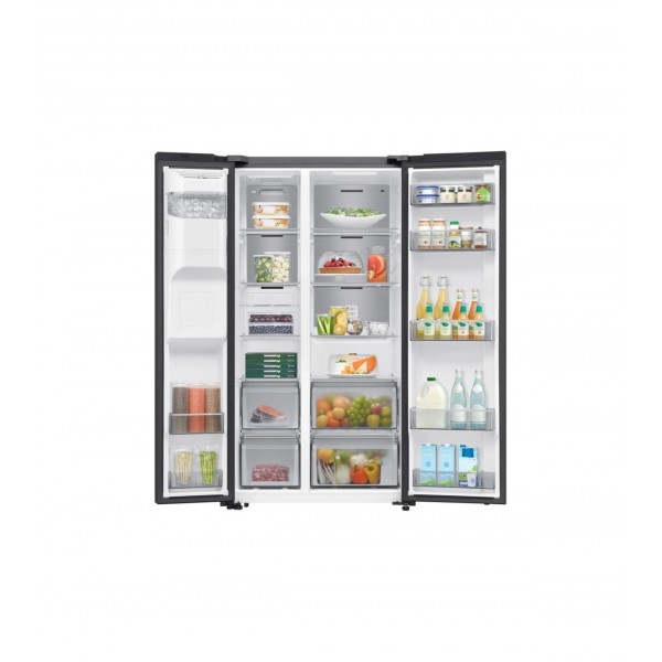 Samsung RS70F64KEBEO on suure mahutavusega stiilne SBS-külmik. Külmikus on metallist jahutuspaneel, mis mitte ainult ei näe elegantne välja, vaid aitab ka temperatuurikõikumisi tasandada, eriti siis, kui ust sageli avada. Suured klaasriiulid ja uksetaskud pakuvad paindlikkust toiduainete paigutamisel. Veejaoturi ja jäämasina abil on Sul alati jahe vesi ja jääkuubikud käepärast.
