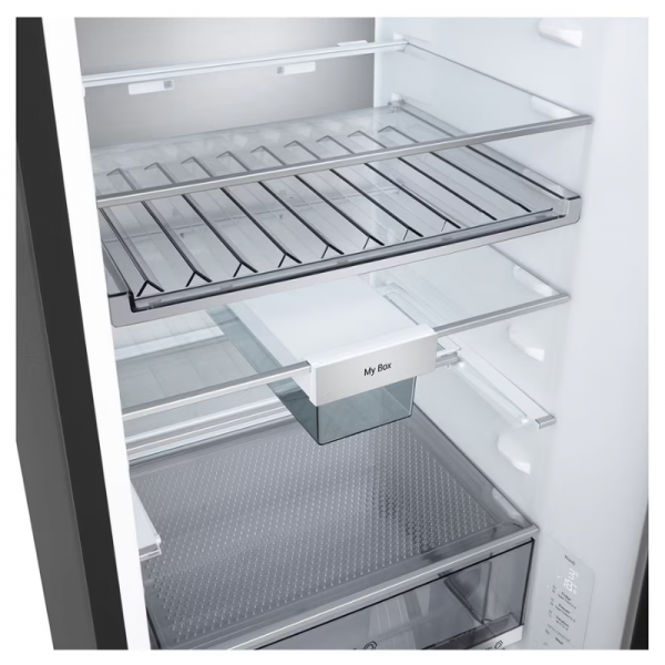 Sisemus on loodud maksimaalse paindlikkuse jaoks, sisaldades eemaldatavat kasti, reguleeritavat riiulit, ukseriiuleid, madalat veini- ja õlleriiulit, sissetõmmatavat riiulit ning praktilist My Box hoiulahendust.
