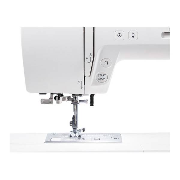 Arvutipõhine õmblusmasin Horisontaalne täispöörlev konks Vabakäe / lameda alusega teisendamine Pealtlaetav – kategooria B Masina mõõtmed: L 406 x K 302 x S 177 mm Käe vahe: 170 mm Sisseehitatud pisteid – 40 (sh 3 nööpauku) Ligikaudne kaal: 5,9 kg Superior söötmissüsteem (SFS) / 7-osaline söötmiskoer LCD-ekraan taustvalgustusega Maksimaalne piste pikkus: 5 mm Nõela niiditaja Valge LED-tuli Maksimaalne õmbluskiirus: 820 silmust minutis Kiiruse reguleerimise liugur Maksimaalne piste laius: 7 mm Start/Stopp nupp Horisontaalne poolitihvt Jala surve reguleerimine (6 taset) Sisseehitatud pistete võrdlustabel Manuaalne niidipinge reguleerimine Nõel üles/alla (vaikimisi all) Lihtne pooli seadistamine Tagurpidi nupp Pikenemine (kuni 5 korda) Automaatne poolikerija Langetusnupp Automaatne pistelukustus Toitelüliti Kinnitusjalg Topeltinõela võimalus Kõva kate Kandekäepide Päritolu: Taiwan