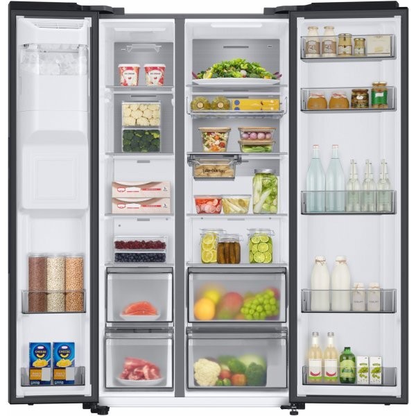 Samsung RS68CG885DB1EF. Seadme paigaldus: Eraldiseisev, Tootedisain: Kahepoolne, Toote värv: Must. Neto kogumahutavus: 634 l, Kliimaklass: Kliimaklass SN-T, Müraemissiooni klass: B. Külmkapi netomahutavus: 409 l, Lambi tüüp: LED. Sügavkülmiku netomahutavus: 225 l, Sügavkülmiku paigutus: Külgmine, Külmutusvõimsus: 15 kg/24 h. Energiatõhususe klass: D, Aastane energiakulu: 281 kWh, Energiatõhususe skaala: A-st G-niDisain Lapselukk Jah Külmaaine R600a Toote värv Must Kontrolli tüüp Puudutus Sisseehitatud ekraan Jah Riiulite materjal Karastatud klaas Tootedisain Kahepoolne Seadme paigaldus Eraldiseisev Kuvari paigutus Sees Reguleeritavad riiulid Jah Süvistatavad käepide(med) Jah Toimimine Neto kogumahutavus 634 l Kliimaklass Kliimaklass SN-T Jäävalmistaja Jah Müratase 35 dB Veekraan Jah Minimaalne töötemperatuur 10 °C Maksimaalne kasutamistemperatuur 43 °C Puhkuse funktsioon Jah Invertertehnoloogia Jah Müraemissiooni klass B Jaoturi paigutus Läbi ukse Külmik Külmkapi netomahutavus 409 l Pudeliriiul Jah Munariiul Jah Külmkapi riiulite/korvide arv 4 Aedviljasahtlite arv 2 Lambi tüüp LED Külmiku ukseriiulid 5 Jäävaba (külmik) Jah Külmkapi sisemuse valgustus Jah Kiirjahutusfunktsioon Jah Sügavkülmik Kiirkülmutuse funktsioon Jah Sügavkülmiku netomahutavus 225 l Sügavkülmiku riiulite/korvide arv 4 Sügavkülmiku temperatuur (minimaalne) -19 °C Külmutusvõimsus 15 kg/24 h Sügavkülmiku paigutus Külgmine Säilitamise aeg elektrikatkestuse ajal 7 h Sügavkülmiku ukseriiulid 2 Jäävaba (sügavkülmik) Jah Sügavkülma sisemuse valgustus Jah Külmiku köögiviljasahtlite arv 2 Ergonoomika Avatud ukse alarm Jah WiFi Jah Võimsus Aastane energiakulu 281 kWh Energiatõhususe skaala A-st G-ni Energiatõhususe klass D Kaal ja mõõtmed Sügavus 716 mm Sügavus avatud uksega 116,5 cm Kõrgus 1780 mm Kaal 122 kg Laius 912 mm Laius avatud ukse korral 173 cm Kaubamärgile omased tunnused Samsungi tehnoloogiad (toiduainete säilitamine) Twin Cooling Plus™, SpaceMax™ Technology, Smart Conversion Pakendi andmed Pakendi kaal 127 kg Pakendi sügavus 776 mm Pakendi kõrgus 1912 mm Pakendi laius 980 mm