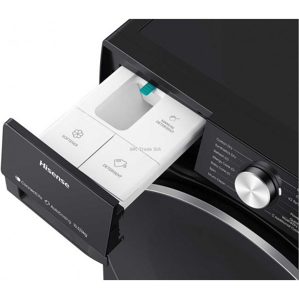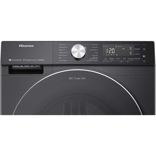 Kõrge tsentrifuugimiskiirus Hisense WD5S1045BB pesumasina maksimaalne tsentrifuugimiskiirus on 1400 p/min, mis on märkimisväärne tõus. Teie pesu on kohe pärast pesemist oluliselt kuivem, säästes kuivatamise aega. WiFi Juhtige oma Hisense WD5S1045BB pesumasinat juhtmevabalt nutiseadmest (sülearvuti, tahvelarvuti või nutitelefon). See on võimalik tänu WiFi ainulaadsetele võimalustele! Elektrooniline puutetundlik juhtimine Soovitud programmide seadistamine pole kunagi varem olnud lihtsam, kuna Hisense WD5S1045BB pesumasinal on elektrooniline puutetundlik juhtimine, mis tähendab, et saate kõiki režiime seadistada nuppude vajutamise või puuteplaadi puudutamise abil. Aurutöötlus Kangaste aurutöötlus Hisense WD5S1045BB pesumasinaga on tõhus antibakteriaalne meetod. Pihustades auru ühtlaselt kangale, desinfitseerib ja puhastab see põhjalikult sügavalt kinni jäänud mustuse ja kangekaelsed plekid, sarnaselt keemilise puhastusega. Samuti lahustab see täielikult pesuvahendid ja puhastusvahendid, vältides seeläbi allergiliste reaktsioonide teket nahal. Silent System: Ärge laske pesumasina müral ja mürinal end enam häirida! Silent Systemiga on Hisense WD5S1045BB pesumasina pesu- ja tsentrifuugimistsüklid praktiliselt vaiksed. Viitstart: Funktsiooniga "Viitstart" saate Hisense WD5S1045BB pesumasina käivitust edasi lükata endale sobivamale ajale alates . Te ei pea õhtul pesu välja riputamiseks pesutsükli lõppu ootama.