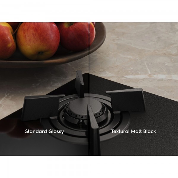 Tekstuurne mattmust viimistlus ja sõrmejäljekindel karastatud klaas tagavad gaasipliidiplaadil püsivalt kauni välimuse. Peale selle on seda lihtne puhastada. Pliidiplaat sobib sujuvalt samas stiilis õhupuhastiga, luues moodsa ja tervikliku esteetika.